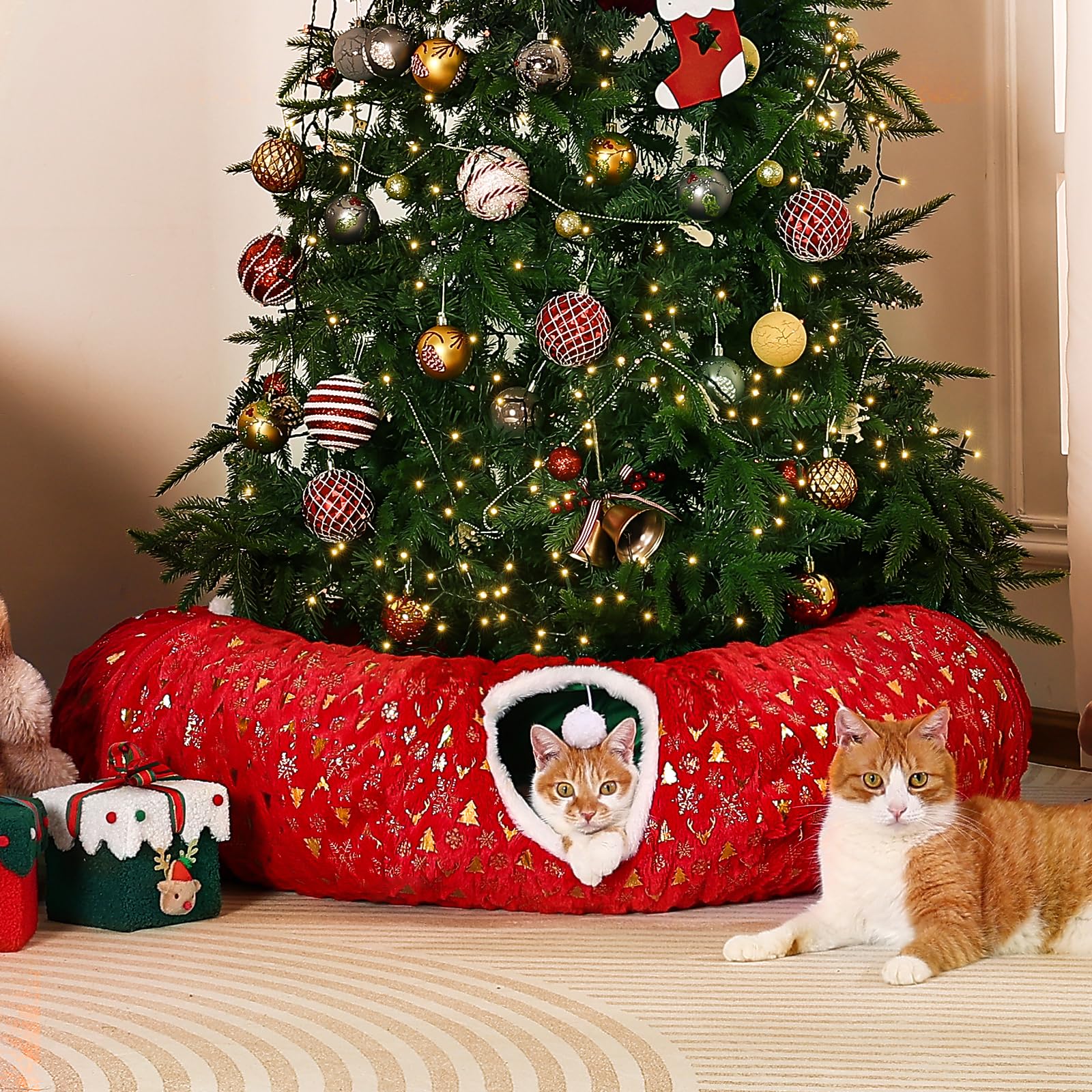 - đ»[Festive Design That Protects Your Decor] Dressed in festive colors and elegant gold accents, this christmas tree cat tunnel blends seamlessly with your holiday dĂ©cor. Itâs the perfect under-tree solution designed to attract your catâs attention away from your precious ornaments and gifts, saving your tree from playful paws while looking stunning.