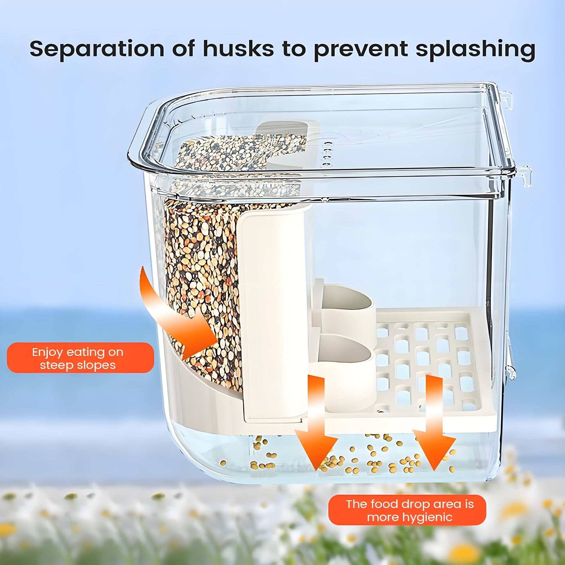 Built-in surrounding groove catches shells and scattered seeds, preventing mess and keeping the cage clean and hygienic.
