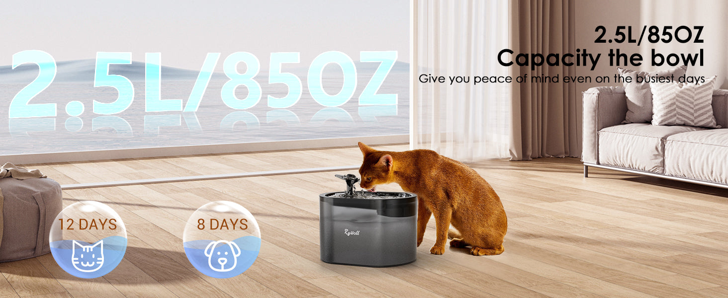The built-in 2.5L water fountain uses a triple-layer filtration system to remove impurities and encourage healthier hydration, providing clean, fresh water all day.