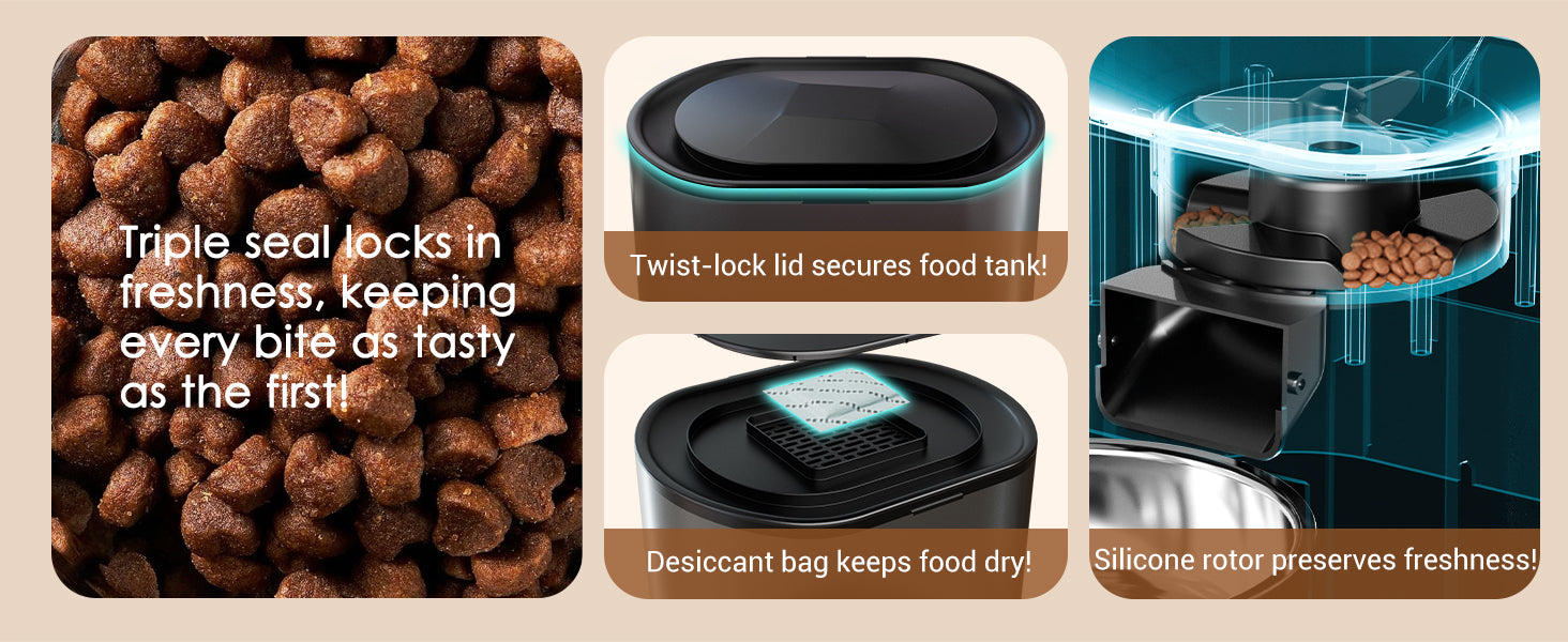 A sealed lid, anti-jam rotor, secure locking system, and built-in desiccant work together to keep dry food fresh, crunchy, and protected from moisture and curious paws.